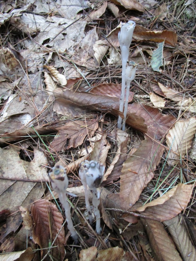 Ghost Pipe lack chlorophyll and are parasitic, getting their nutrients through mycorrhizal fungi.