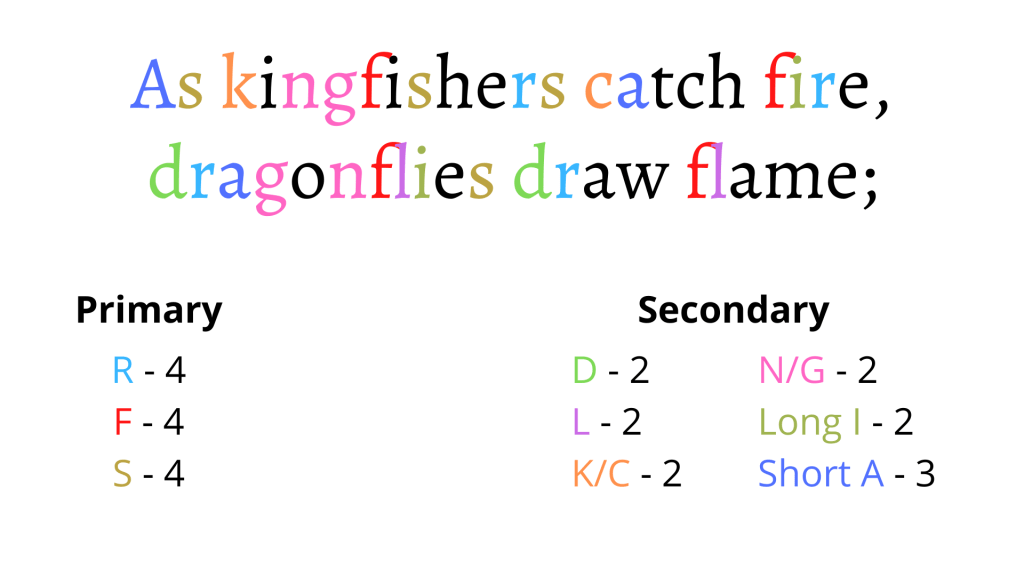 Then, I charted the alliteration for each passage. Below is a color-coded chart for the first line of the passage on the right. It includes commonly-used primary sounds (melody) and secondary sounds (harmony) that were the best examples of consonance, assonance, and sibilance.