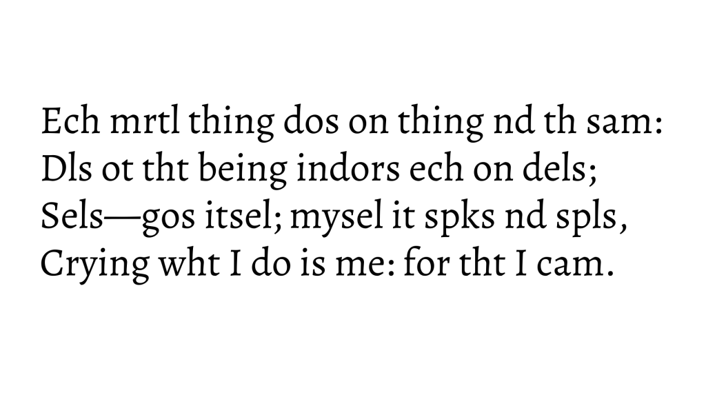 As an experiment, I isolated two passages from the Gerard Manley Hopkins poem “As Kingfishers Catch Fire” and charted the alliteration.