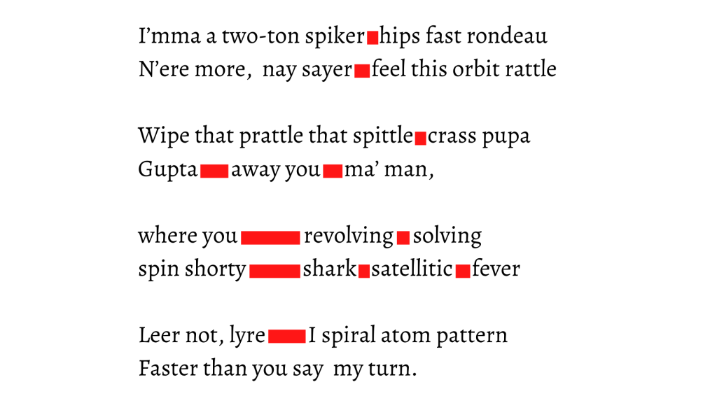 If you are scoring a poem the way your score music, you also include different lengths of rests or pauses (white space) within the poetic line. An example of this is Cathy Park Hong’s “The Hula Hooper’s Taunt.”