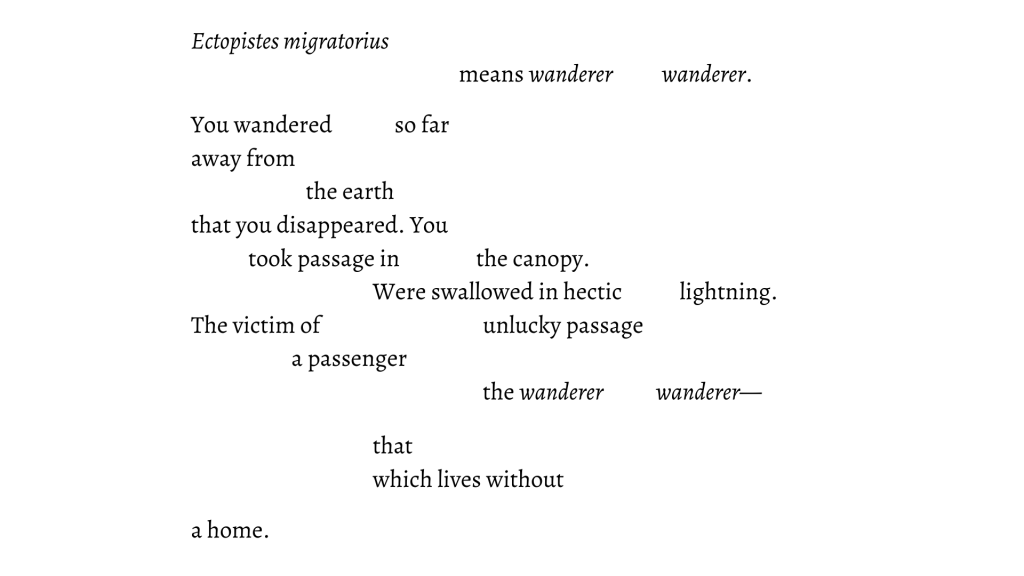 The third example of this phenomenon is a poem of my own, titled “Elegy for Ectopistes Migratorius.”