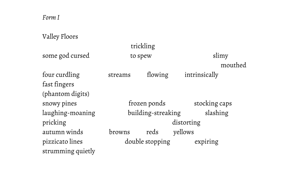 Another example of this phenomenon is “Form I” from “A Collage for Richard Davis–Two Short Forms” by innovative writer De Leon Harrison.