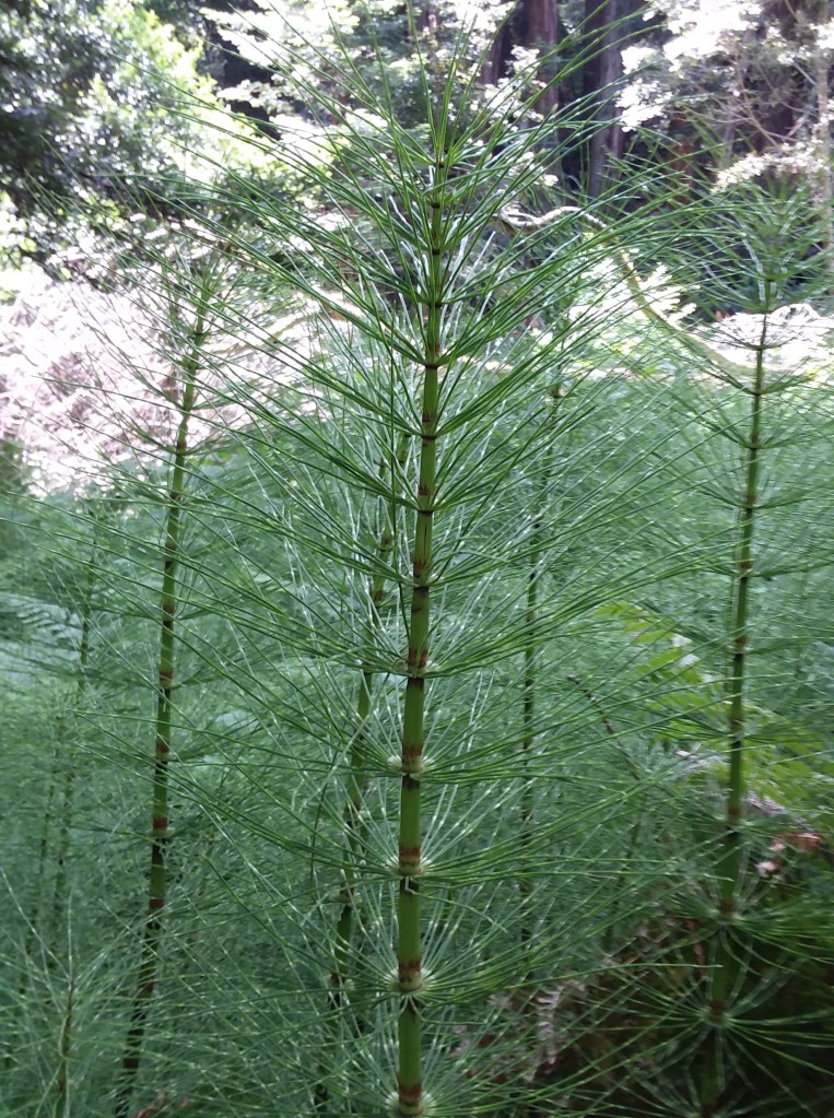 Redwood sorrel is related to common yellow woodsorrel. Both are edible, but redwood sorrel is only safe to eat in small amounts. Horsetails are over 300 million years old, and like the ferns they grow with, they reproduce using spores.