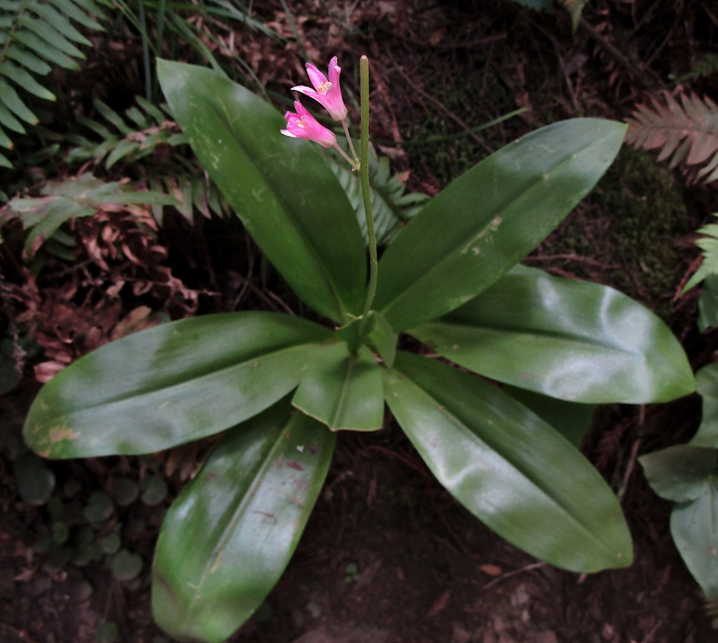 Their bright pink flowers stick out against the forest floor of dark green ferns.