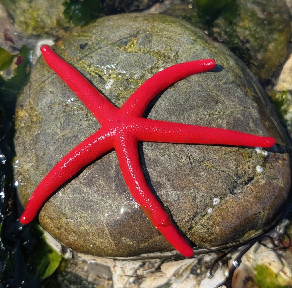 - Pacific Blood Star: The Pacific blood star is a strikingly colored blood-red starfish. It is commonly found under rocks or in shoreline areas still underwater at low tide.