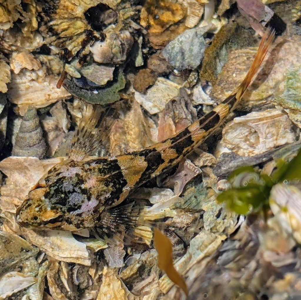 - Tidepool Sculpin: The tidepool sculpin is a small fish commonly found in rocky tidepools. It is mottled with various shades of white, brown, and dark gray.