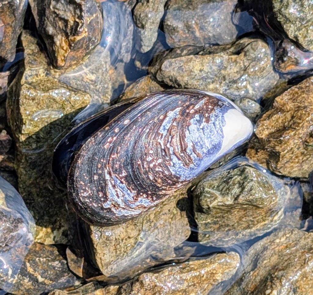 - California Mussel: The California mussel is an edible mollusk with a midnight blue shell. It is found along the Pacific coast from Alaska to Mexico.