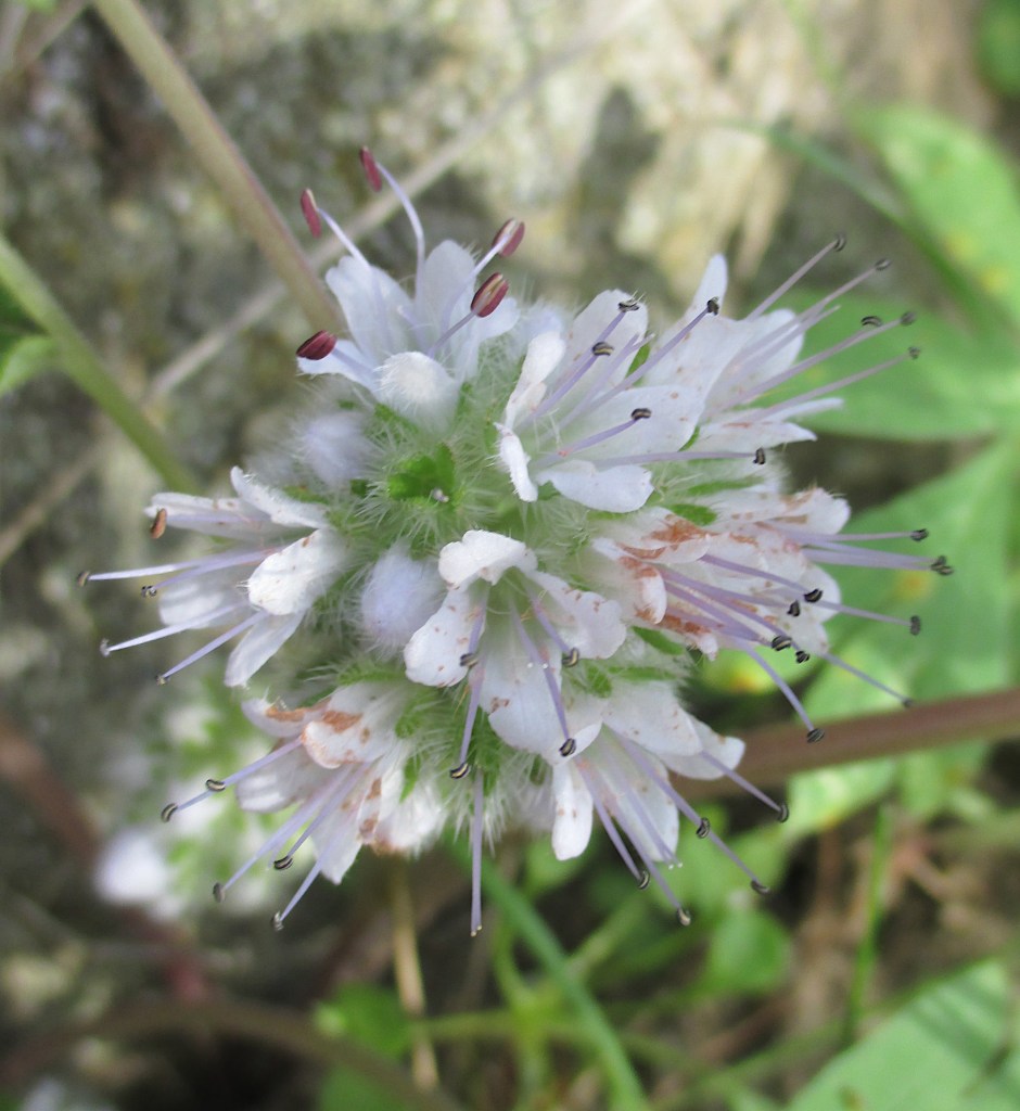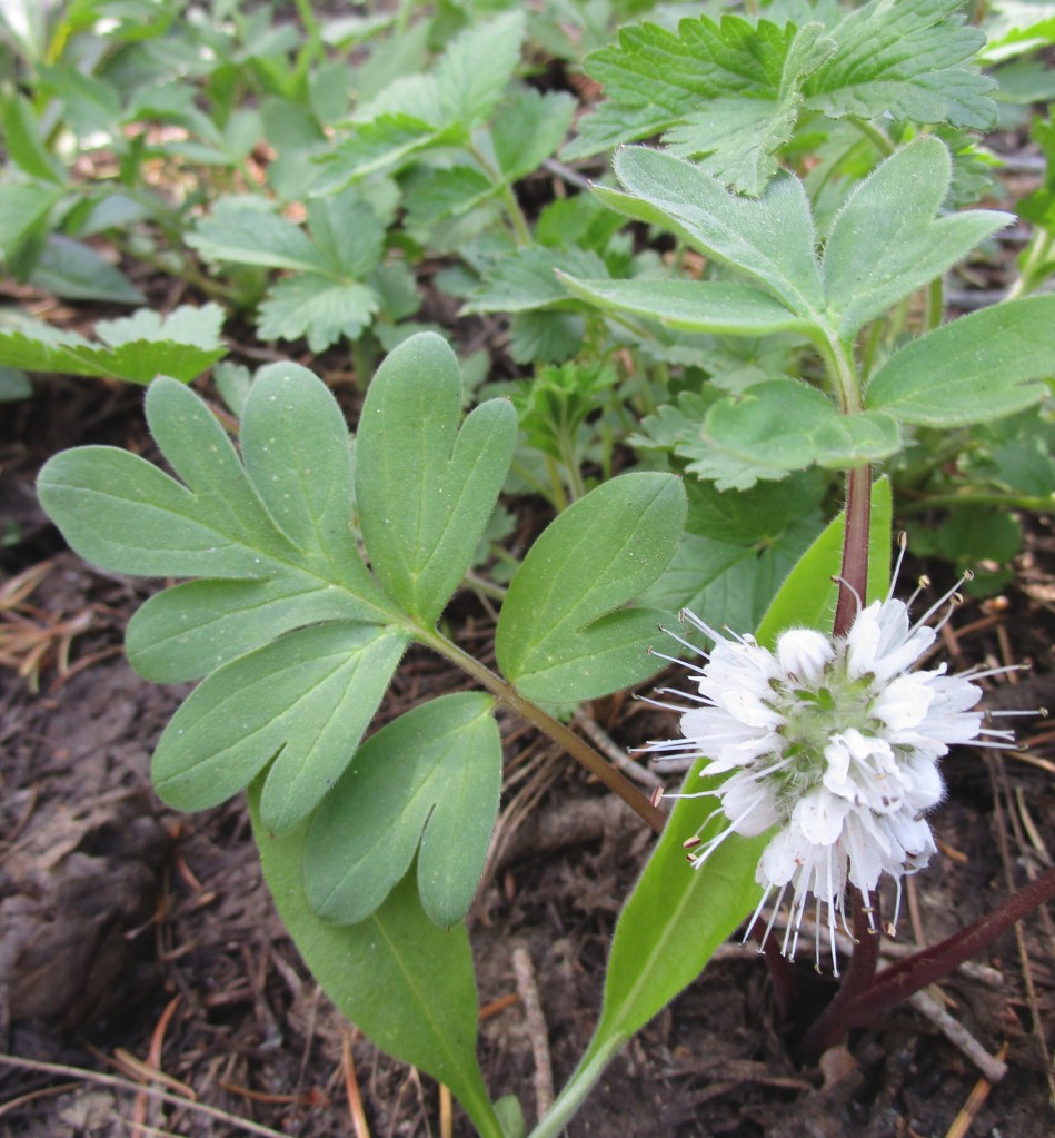 Ballhead waterleaf grows low to the ground and is often overlooked. The plant has dense, ball-like clusters of pale purple or whiteish flowers. The flowers grow near the base of the plant and may be hidden beneath leaves. The stamens extend beyond the petals; this gives the flowers a bristly look. The leaves are hairy with deeply-divided lobes. The plant is 4-16 inches tall. It is found in Hulls Gulch.