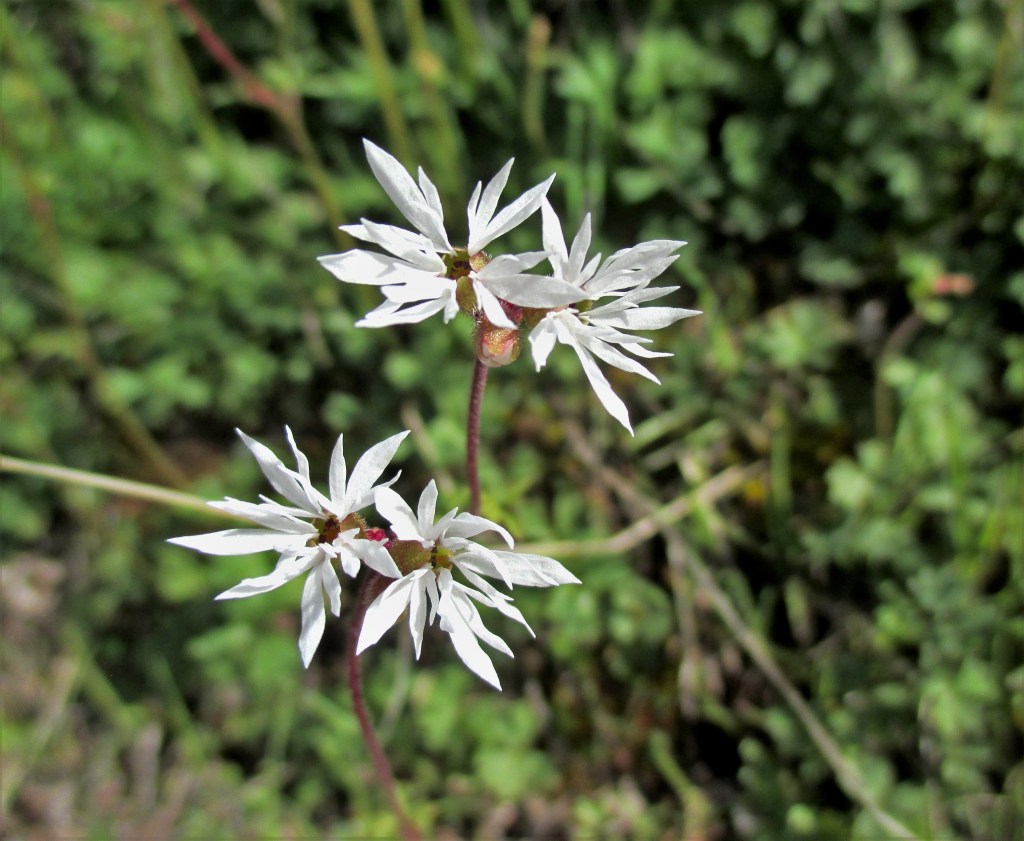 The woodlandstar is a fragile-looking wildflower that blooms in early spring. Each flower has 4-5 whitish petals incised into 3-4 narrow fingers. The plants are delicate, with dark red stems, and produce small bulbs where the stems and leaves meet. The leaves are greenish-purple, palmate, and deeply lobed. There are two varieties in the area, smallflower woodlandstar (pictured left) and bulbous woodlandstar (pictured right). It is 4-10 inches high. It is found in Camel’s Back Park, Hulls Gulch, and Military Reserve.