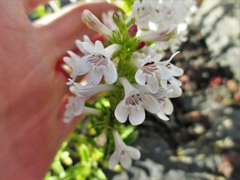 Hotrock penstemon has several stems of bilaterally-symmetrical flowers. The flowers are trumpet-shaped with fine purplish lines inside the throat; flowers have a faintly unpleasant odor. The leaves are ovate and strongly serrated. The plant is between 8-15 inches tall. It is found in Military Reserve and Hulls Gulch.