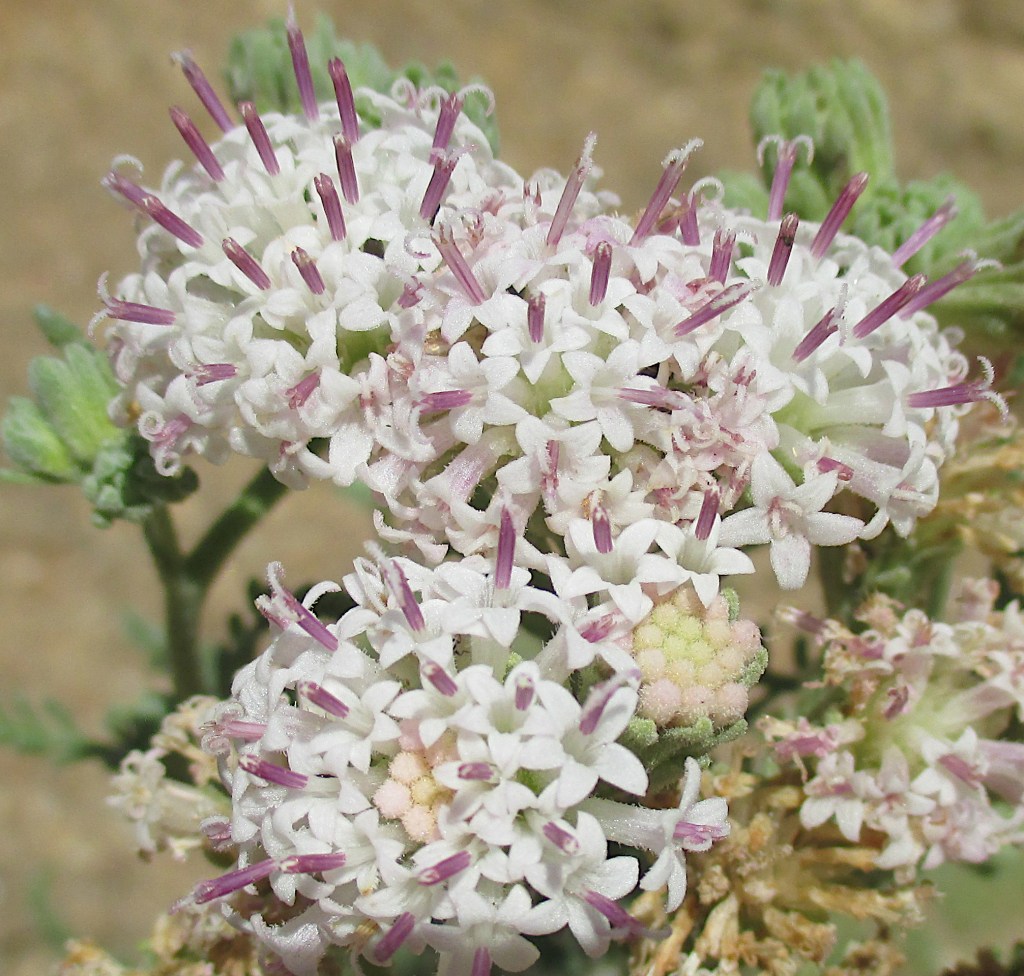 Douglas’ dustymaiden has inch-long clusters of 40-50 tubular flowers in white or pale pink. Forked styles tinted lavender or pink protrude from the flowers like a pincushion. The gray-green leaves are frilly and fern-like. The plant is 8-24 inches tall. It is found in Hulls Gulch and Military Reserve.