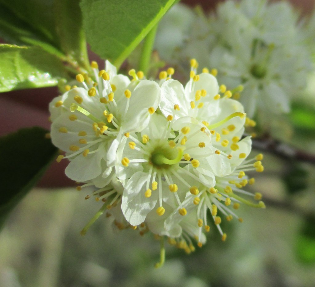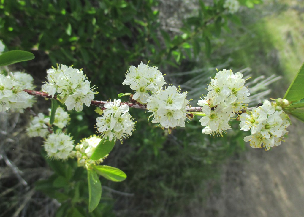Bitter cherry is a thicket-forming shrub with reddish bark and ovate, finely-toothed leaves. In the spring, it has loose, flat clusters of five-petaled flowers on upright branches. The flowers have several hair-like stamens. The flowers are replaced by small, dark red cherries that taste extremely bitter. It can be upwards of 20 feet high. It is found in Hulls Gulch.